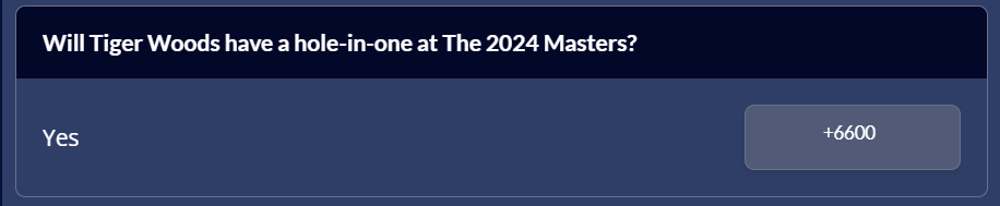 That Tiger is the top former winner is +3500. Tiger has had three holes-in-one in his PGA Tour career but none at the Masters – there have been 34 all-time at the tournament. That Tiger gets one this week is +6600.