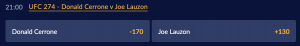 Cerrone is a -170 favourite to win on the MMA odds, while Lauzon is a +130 underdog. The total rounds is set at 2.5 with the Under favoured at -180.