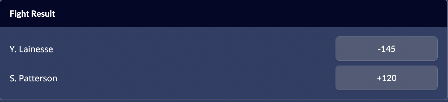 Lainesse as a -145 favourite to win on the MMA odds and Patterson is a +120 underdog.