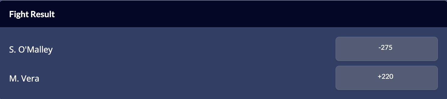 O’Malley is a -275 favourite to win on the MMA odds, while Vera is a +220 underdog.