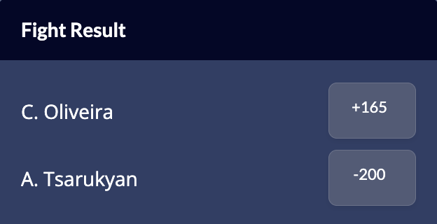 The rising Tsarukyan is a -200 favourite to win on the MMA odds with Oliveira sitting as a +165 underdog.