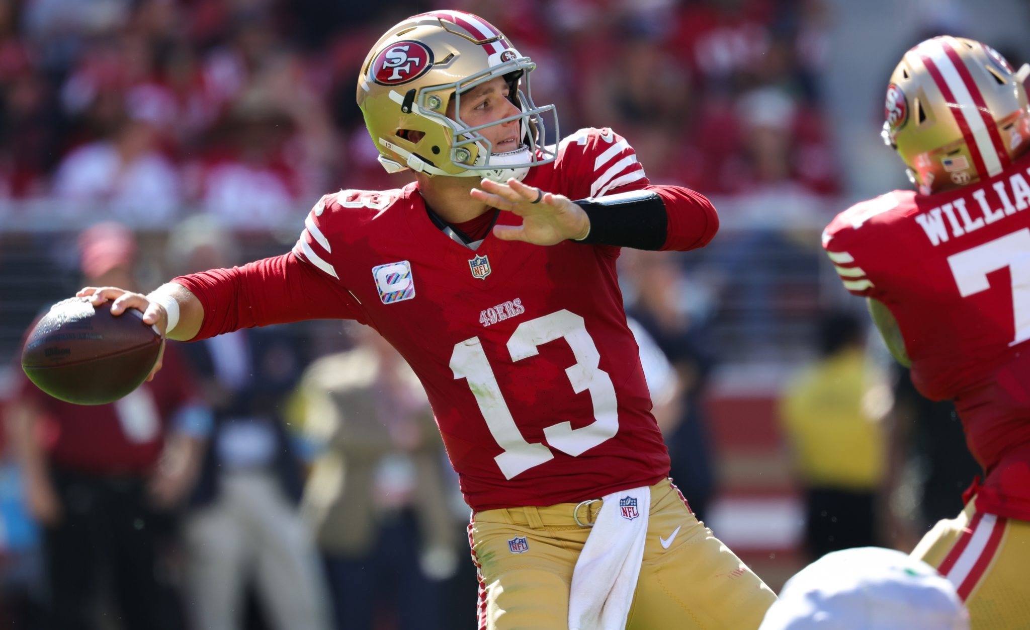 Brock Purdy was efficient last week, passing for 288 yards, one TD and one interception. Purdy has been known more as a game-manager early in his career, but it’s worth noting he ranks fourth in passing yards (1,130) after the first month of the season. Jordan Mason had a monster performance last week, rushing for 123 yards and a touchdown on 23 carries. Mason has the second-most rushing yards in the NFL (447) and he’s rushed for 100 yards or more in three of four games.