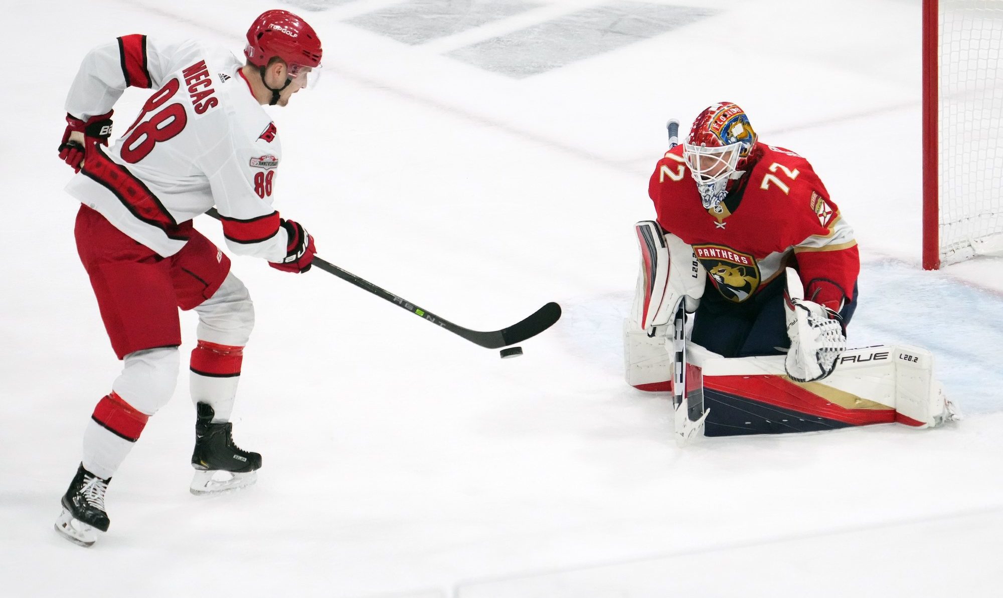 Game 3 saw the Hurricanes come out guns blazing, racing out with a flurry of good scoring opportunities – almost literally with a couple breakaways and partial breakaways. But time and time again they could not outduel Sergei Bobrovsky. The frustration was visible after the game with Jesperi Kotkaniemi smashing his stick to bits whilst heading back to the dressing room. Carolina shot 32 times to Florida’s 17 attempts. Through three tilts, the Canes have fired 135 times in the direction of the Florida keeper and they have three goals to show for their efforts.