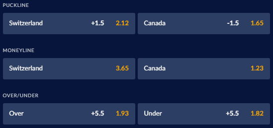 It’s no surprise that Canada is an overwhelming favourite in this one – and they have the puckline edge, as well, sitting at -1.5 -155. A whopping 97 percent of Sports Interaction bettors are going with the Canadians, who won all six of their games in Sochi four years ago and allowed just one goal in the elimination round. The Swiss are listed at +265 SU for this one; they were eliminated by Latvia in the first elimination round back at the 2014 Winter Games.