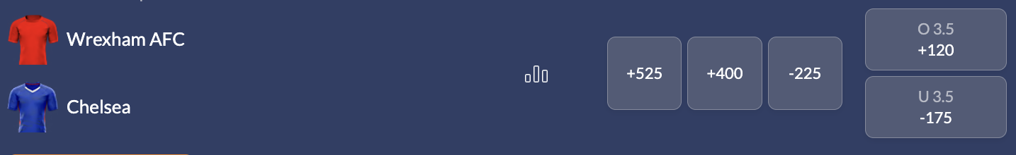 Chelsea is a -225 favourite to win on the FA Cup odds, while Wrexham is a +525 underdog and a draw is listed at +400. The total is pegged at 3.5.